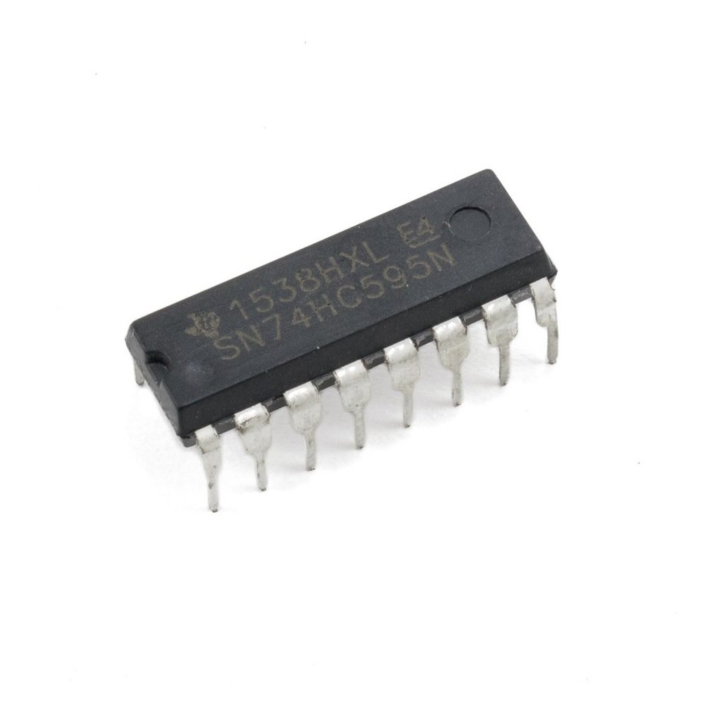 Registro de desplazamiento de 8 bits 74HC595, entrada serial y salida paralela o serial, salidas tri-estado con cerrojos (latches), entradas de reloj activadas por flanco de subida. CMOS