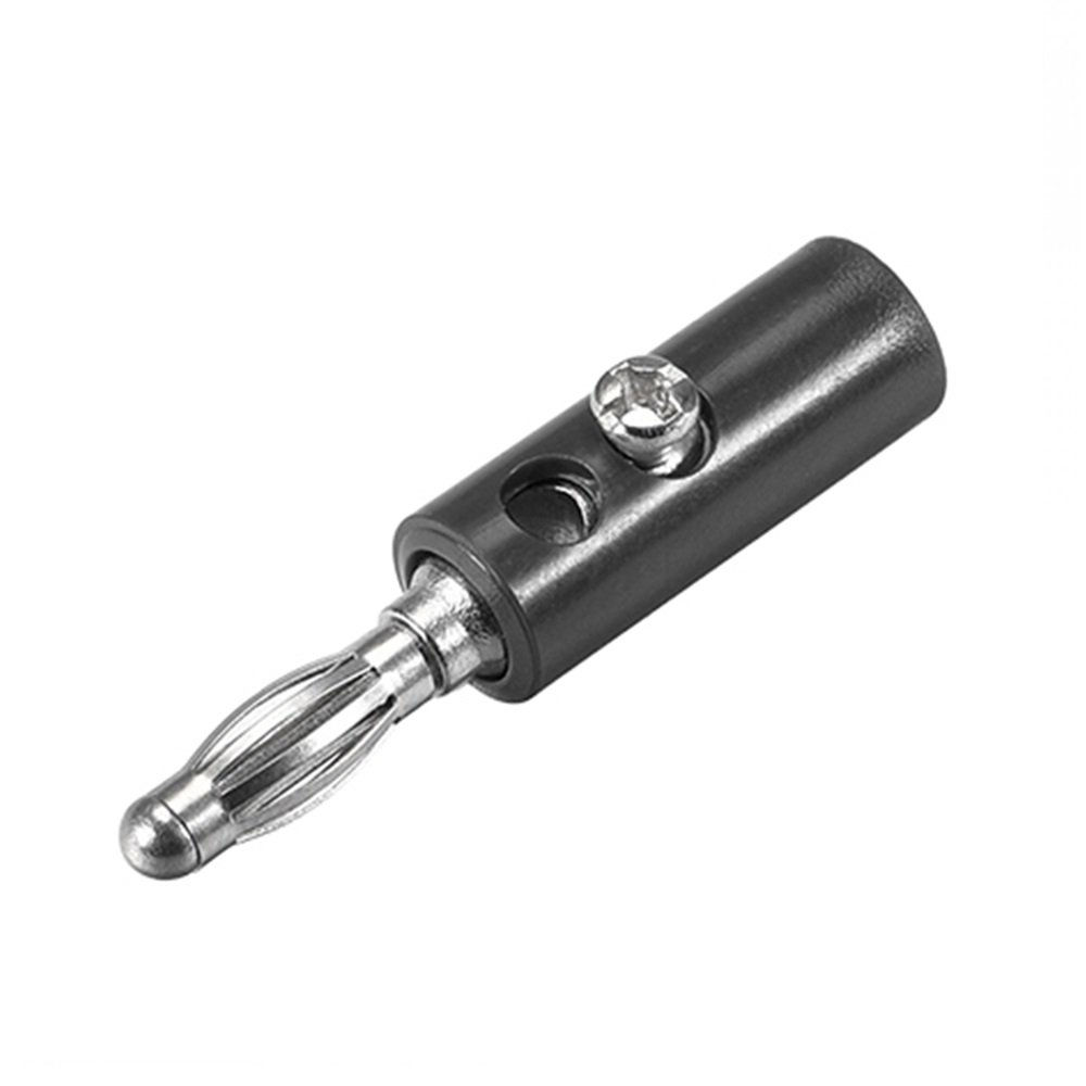 Plug Banana Negro con tornillo opresor para sujetar cables. Los conectores banana son un tipo de conector muy usado en instrumentos de medida eléctrica o electrónica como generadores, fuentes o Multímetros. También es usada a la salida de amplificadores de audio y en la entrada de muchos parlantes de buena calidad.
