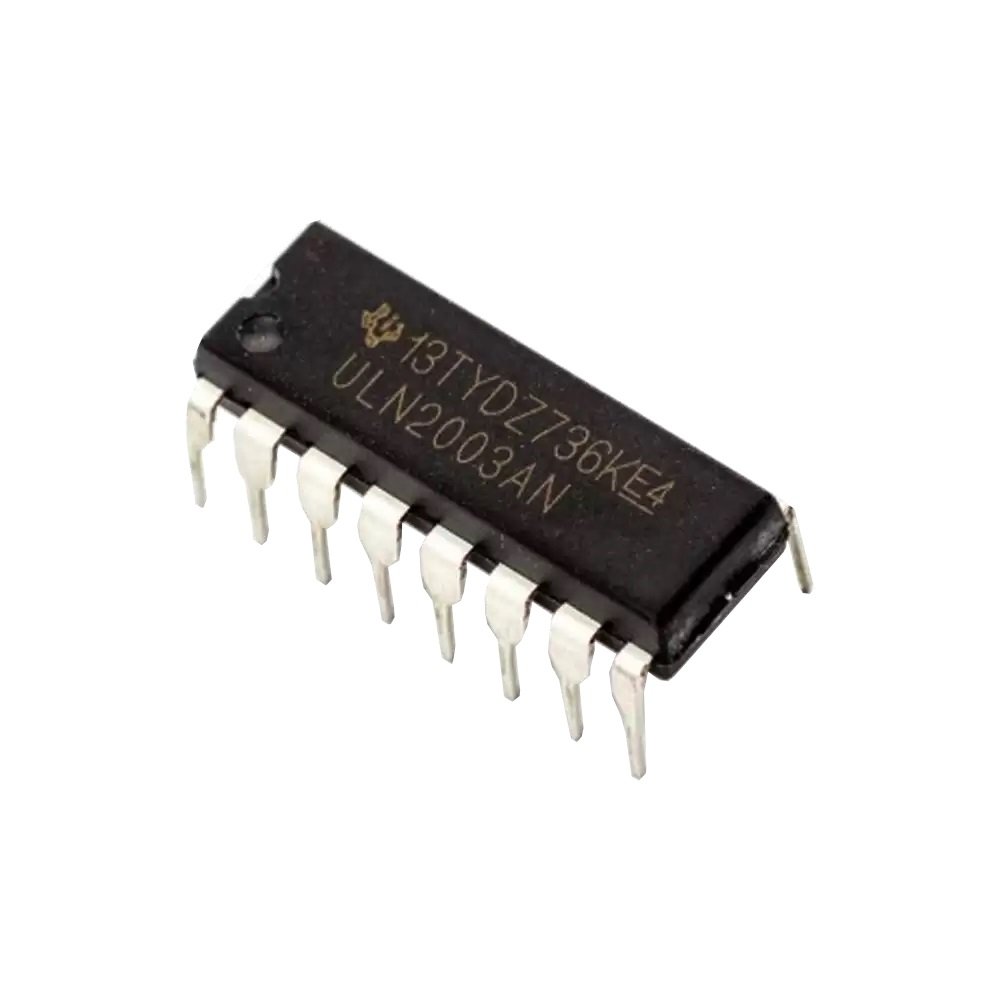 El ULN2003 es un arreglo de siete transistores Darlington NPN con emisor común e incluye diodos de supresión de picos de tensión para las cargas inductivas.